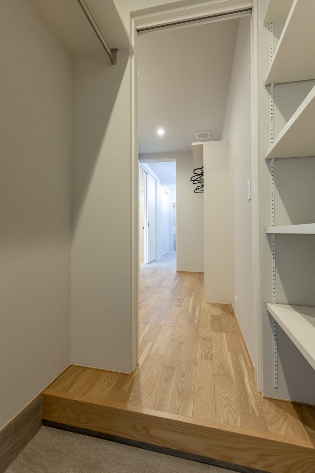 脱いだ靴をサッと入れられる扉のない収納棚や、冬場のコート類などを掛けられるハンガーポールなどの収納スペースをお作りしました。