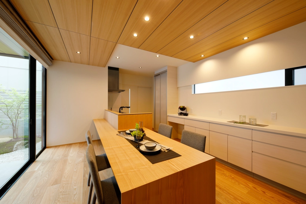 メリハリある横長連続窓と、落ち着き感じるミドリの坪庭が見どころ。