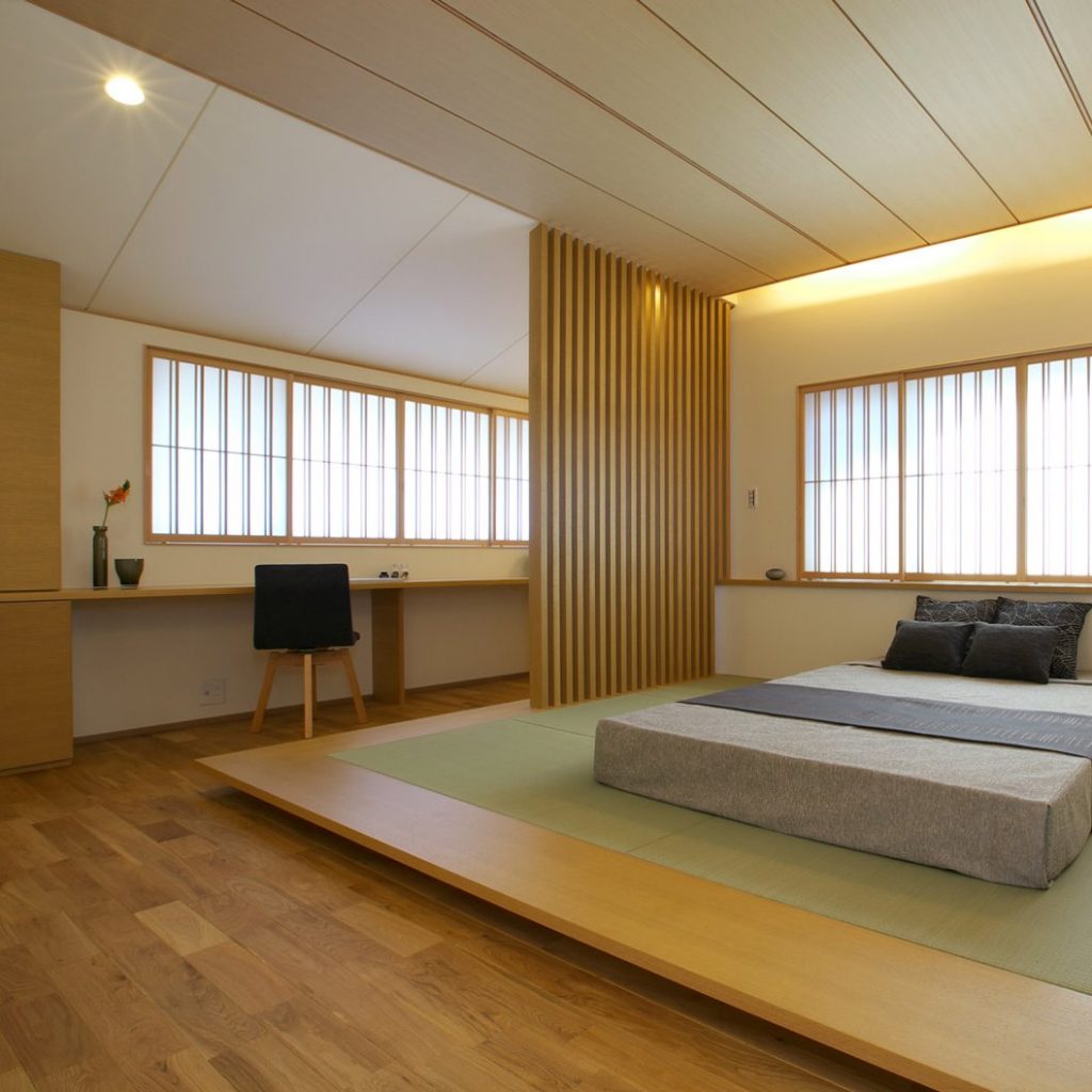 住宅全体が現代の和様コンセプトのため、正面の窓も障子を採用して、やさしい光が差し込む書斎に設計しています。