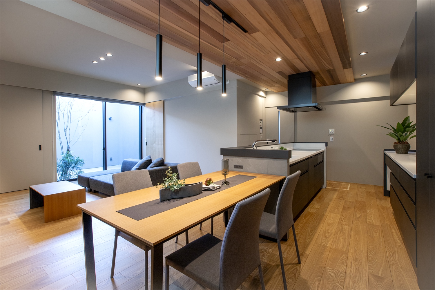 高天井とテラスに繋がる大開口サッシによって、リビングには柔らかな自然光が差し込み、開放感と心地よさに包まれた時間が流れます。