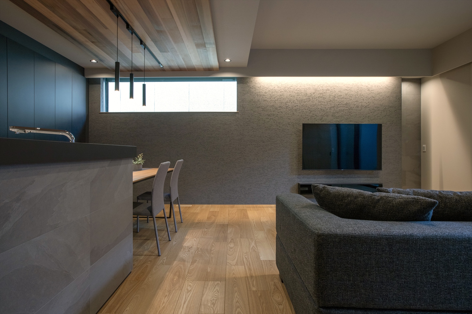 キッチンは大判タイルで、 ホテルのような上質で落ち着いた雰囲気をつくれます。