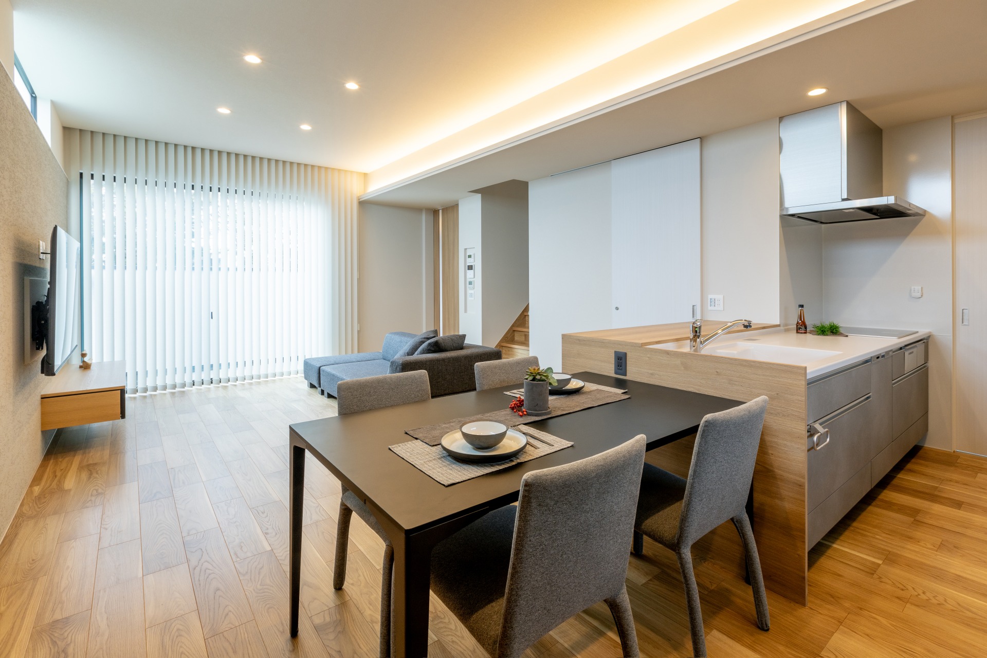 キッチンとダイニングが横並びになった効率的なレイアウトで、配膳や片付けがスムーズ。